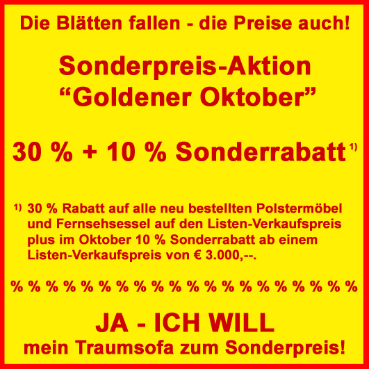 | Beachten Sie bitte auch unsere aktuellen Werbeangebote in unseren Zeitungsbeilagen, Zeitungsanzeigen und in unserer Ausstellung! Abverkaufsgarnituren aus unserer Ausstellung finden Sie unter Sale !